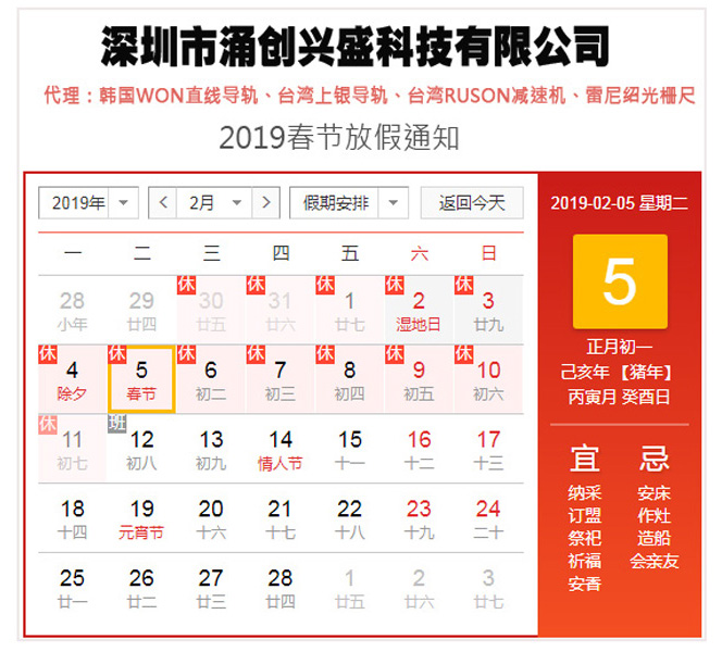 深圳市涌創(chuàng)興盛科技有限公司2019春節(jié)放假通知,公司是一定經(jīng)營(yíng)直線導(dǎo)軌,減速機(jī),光柵尺,直線電機(jī)等自動(dòng)化設(shè)備供應(yīng)廠家!