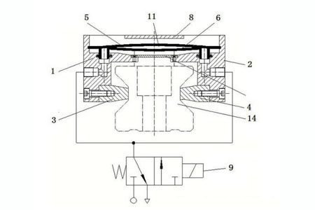 1、右座體 2、左鎖緊片 3、右鎖緊片 4、上彈簧鋼片 5、下彈簧鋼片 6、彈簧片 7、限位凸臺 8 和電磁閥 9,左座體和右座體相對鏡像設置,左座體和右座體上方中心設有限位凸臺 8,左座體 1 和右座體 2 經彈簧片 7 固定連接,左座體 1 和右座體 2 上端中心設有彈簧鋼片腔 12,下端中心設有線軌滑塊移動腔 13,下端一側與左鎖緊片 3固定連接,另一側與右鎖緊片 4固定連接,左座體 1 和右座體 2 外側壁上分別設有氣體通道 10,限位凸臺分別與左座體和右座體固定連接,左鎖緊片 3 和右鎖緊片 4 相對設置,以利于對線軌滑塊進行夾緊制動,彈簧鋼片腔內設有由上彈簧鋼片 5 和下彈簧鋼片 6 周邊密封連接而形成彈簧伸縮囊 11,彈簧伸縮囊 11 一端與左座體 1 固定連接,另一端與右座體 2 固定連接,上端與限位凸臺 8 相抵觸,下端與彈簧片 7 相抵觸,彈簧伸縮囊 11 上設有壓縮空氣出入口,氣體通道 10 一端與壓縮空氣出入口相連通,另一端與氣源相連通,以使彈簧伸縮囊 11內填充有壓力氣體,氣體通道 10上設有電磁閥 9,以利于通過電磁閥 9自動控制彈簧伸縮囊 11 內的氣體含量,使彈簧伸縮囊 11 帶動左座體 1 和右座體 2 相對移動或相背移動,進而實現(xiàn)自動調整左鎖緊片 3 和右鎖緊片 4 對線軌滑塊進行自動夾緊制動的作用。
