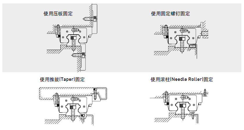 當(dāng)床臺受到振動、沖擊力的作用時,導(dǎo)軌及滑塊很可能偏離原來的固定位置,而影響精度。為避免發(fā)生類似的狀況,建議使用下圖所列的四種固定方式固定導(dǎo)軌及滑塊,以確保機(jī)臺的運行精度。
