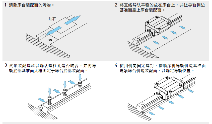 直線導(dǎo)軌必須根據(jù)機(jī)臺使用狀況,如受振動、沖擊力的程度,要求的行走精度及機(jī)臺限制而設(shè)定其安裝方法。