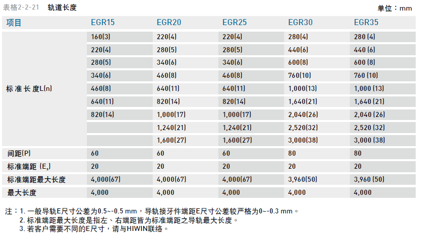 HIWIN 備有導軌標準長度庫存供應客戶需求。若客戶訂購非標準長度導軌時,端面距離E的尺寸最好不要大于1/2P,防止因E的尺寸過大導致導軌裝配后端部的不穩定,而降低直線導軌的精度。