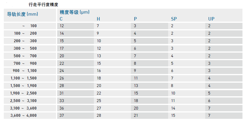 HDS2滾輪導(dǎo)軌分為兩種精度等級:普通級C(commercial)和精密級P(precision), 精度指標(biāo)如下: