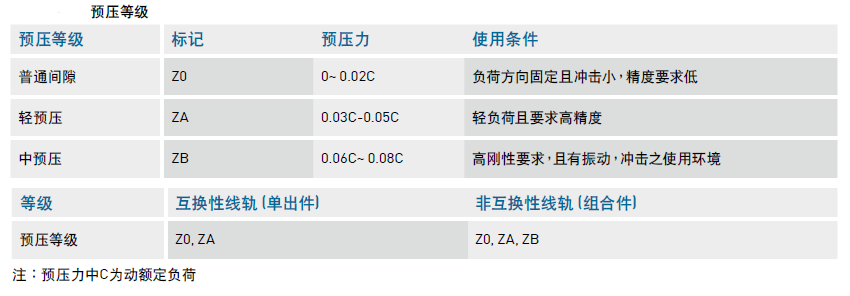 直線導軌的預壓力:所謂預壓力是預先給予鋼珠負荷力,利用鋼珠與珠道之間負向間隙給予預壓,這樣能夠提高直線導軌的剛性和消除間隙。