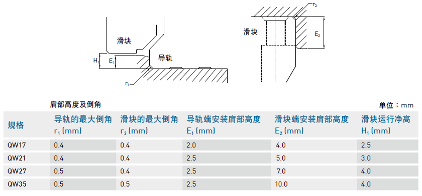 3、安裝注意事項(xiàng), 我們?cè)诔瑢?dǎo)軌的時(shí)候,要注意安裝面肩部高度及倒角,安裝直線導(dǎo)軌時(shí)必須注意安裝面肩部的狀況是否適當(dāng),如倒角過大,凸出的地方易造成直線導(dǎo)軌精度不良,而高度過高則會(huì)干涉滑塊。故如果能依照建議要求安裝面肩部,安裝精度不良即可排除。下表為QW靜音安裝面肩部高度及倒角相關(guān)參數(shù)。